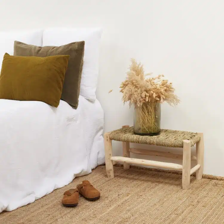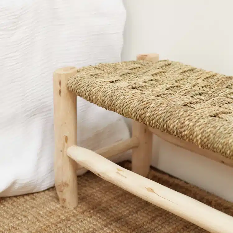 Banquette en bois brut et assise en fibre de palmier tressé. Banc bas en bois typique de l’artisanat Marocain avec sa structure en bois de laurier brut et son assise en fibres de palmier tressées en damier. Ces bancs fabriqués à la main et composés uniquement de matières naturelles ont traversé les tendances et sont maintenant des vrais basiques de la décoration naturelle. Ambiance bohème, esprit campagne ou dans un intérieur chic pour une légère touche nature, le banc Doum s’intègre à tous les styles. Il peut être utiliser en assise classique dans un salon, une entrée ou une salle de bain, mais aussi en bout de lit, bout de canapé ou en table d’appoint avec un plateau. Chaque pièce étant fabriquée à la main, de légères variations de dimensions et de teintes peuvent exister, rendant chaque article unique. Il s’agit de bois 100% naturel, brut et non traité.