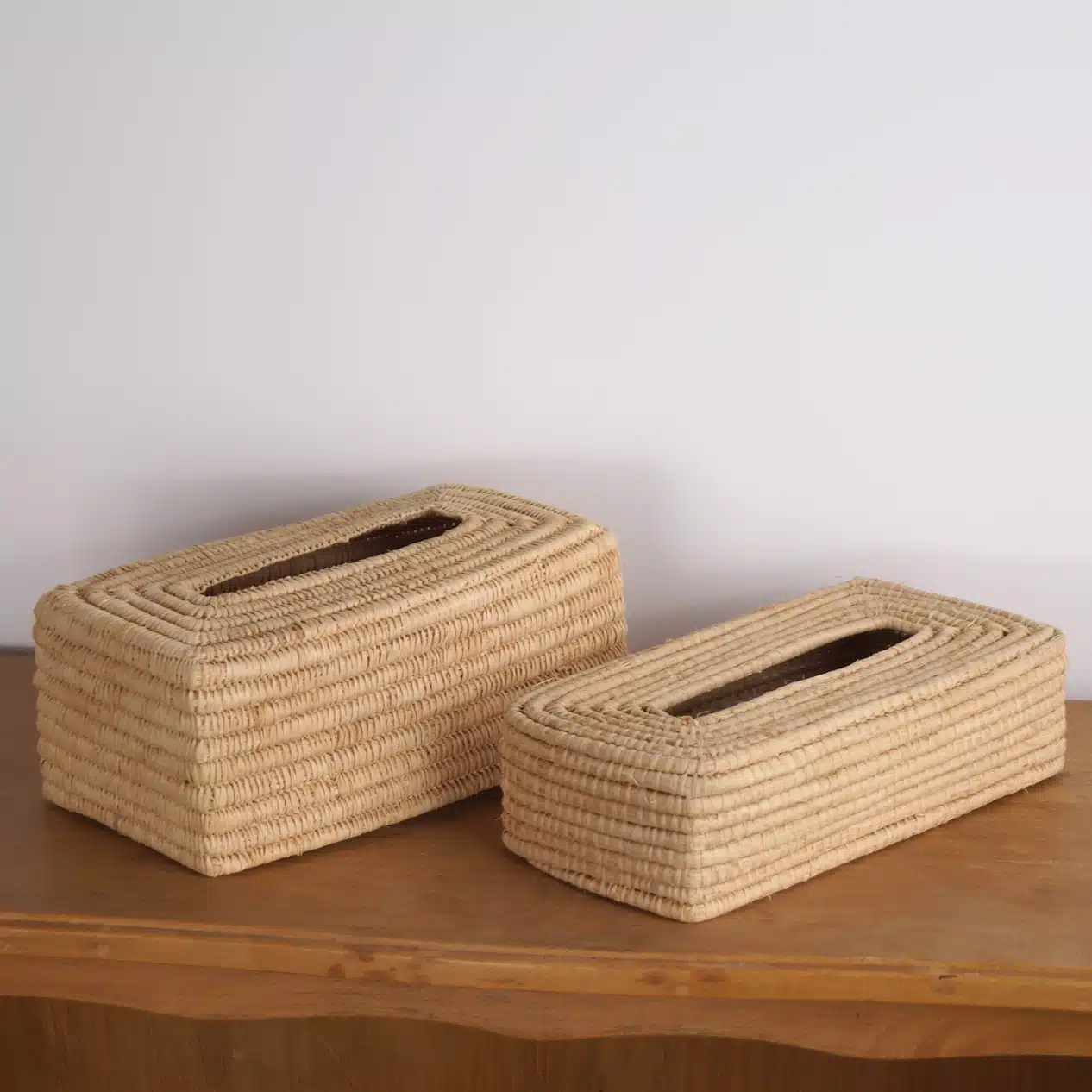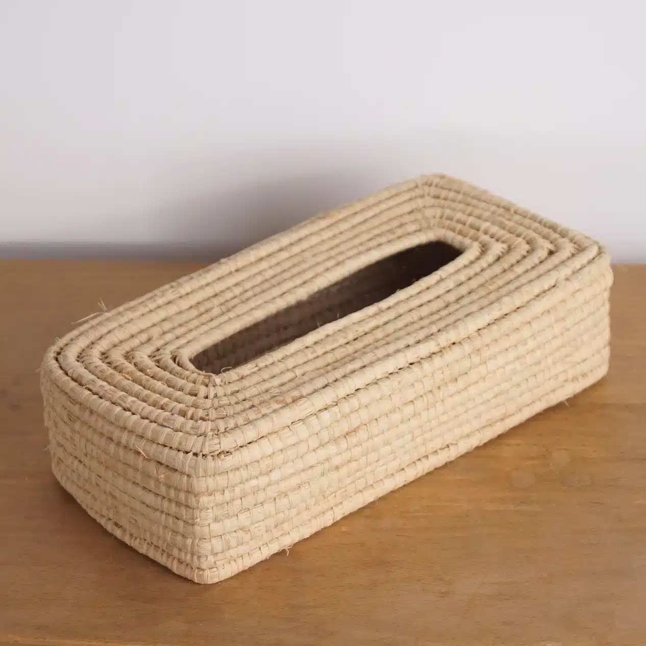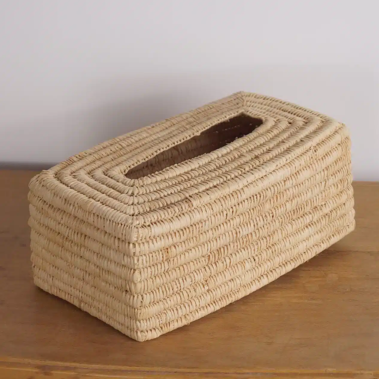 Découvrez la boîte à mouchoirs en raphia tressé pour couvrir les boîtes à mouchoirs en carton. Cette boîte à mouchoirs artisanale apporte une touche naturelle à votre décoration tout en gardant vos mouchoirs à portée de main. Conçue pour s’adapter aux boîtes à mouchoirs rectangulaires standards (2 tailles au choix), cette boîte en raphia naturel s’intègre harmonieusement dans tous les styles de décoration. Son design ethnique et tendance en fait un objet décoratif à part entière, transformant un simple accessoire du quotidien en un élément de décoration. Chaque boîte à mouchoirs en raphia est fabriquée à la main, ce qui lui confère un caractère unique.
