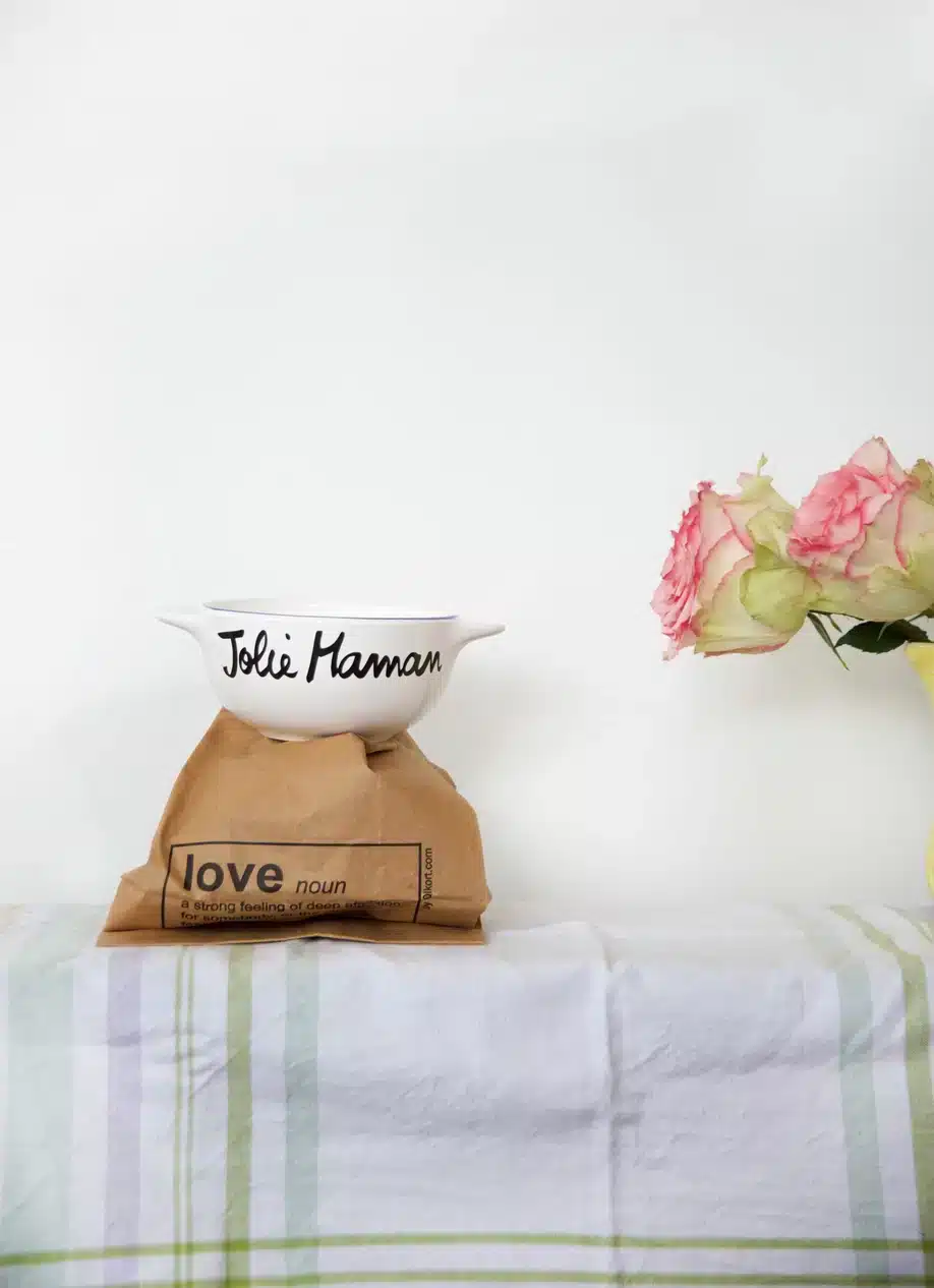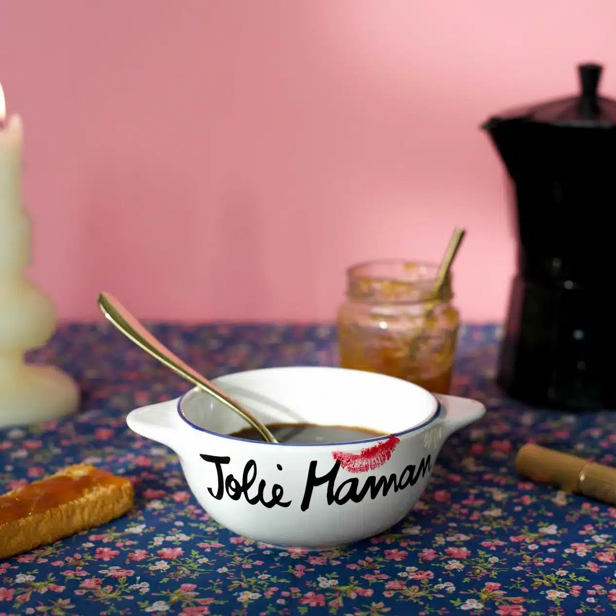 Incontournable monument du kitsch régional, le fameux bol breton nous présente les nouveaux membres de sa famille recomposée. Les prénoms habituels cèdent leurs places à des messages actuels et amusants. À offrir sans modération pour s’éclater au petit-déjeuner ! Dimensions: Diamètre: 12 cm / Hauteur: 6 cm / 30cl Matière : Faïence, filet bleu peint-main Impression : Émail cuit à très haute température – décors inaltérable Vendu avec sa boîte cadeau Fabriqué à la Faïencerie de Pornic, France. Biscuit portugais (pièce non émaillée) Décoré, émaillé, imprimé et cuit avec amour en France Entretien: Lave vaisselle: Ok / Micro-onde : Avec modération