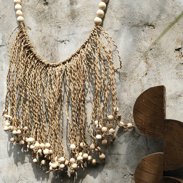 Suspension décorative avec perles de Bali, cette suspension dispose de deux boucles qui permettent de l’accrocher facilement au mur. Grâce à son design large, elle crée un accent remarquable et naturel. La suspension est faite à la main et est un produit naturel. • Dimensions : longueur 95 cm, hauteur 30 cm (hauteur y compris la boucle en corde est de 60 cm) • Matériau : perles en bois, corde