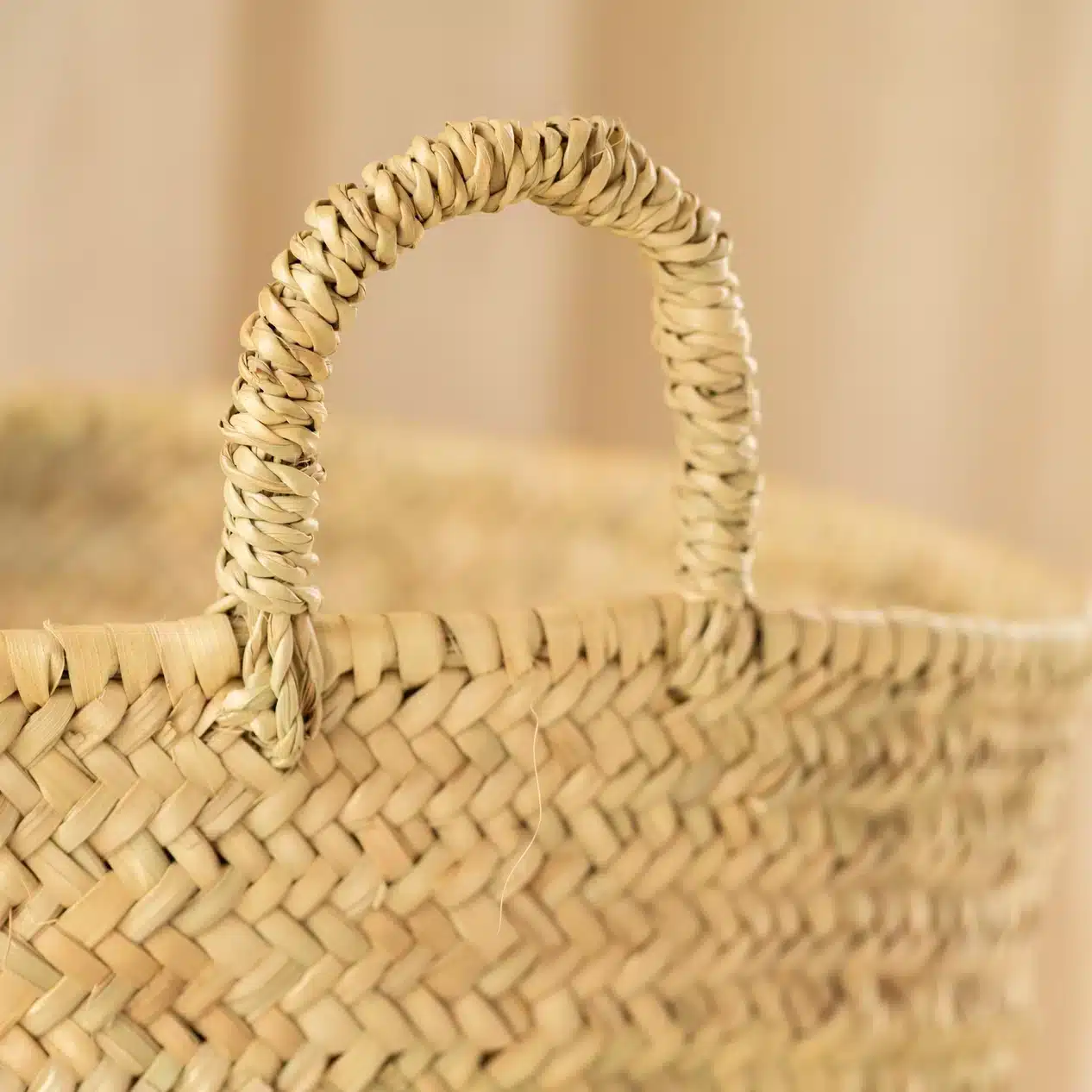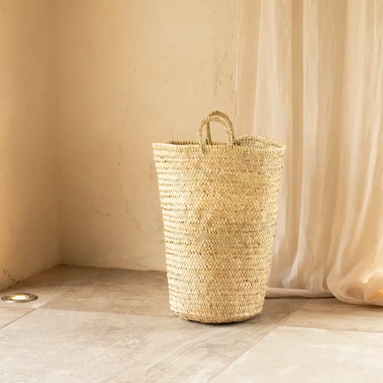 Grand panier en feuilles de palmier tressées à la main pratique et décoratif. Grâce à son format XL et ses deux anses solides, il est idéal pour accueillir du linge, des plaids, des jouets ou encore servir de rangement pour vos accessoires du quotidien. Sa hauteur d’environ 55 cm et son ouverture large offrent une belle capacité tout en conservant une structure élégante. Matière : feuilles de palmier naturelle tressées Dimensions : hauteur 55 cm, diamètre haut 40 cm, diamètre bas 30 cm Couleur : teinte naturelle non traitée Poignées : deux anses intégrées pour un transport facile La fabrication artisanale rend votre article unique. Les dimensions et les couleurs peuvent légèrement varier d’une pièce à l’autre