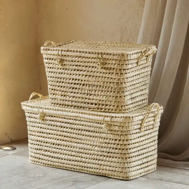 Grande Malle de Rangement en osier tressée à la main. Grand Coffre en Feuilles de Palmier séchées pour ranger linge, jouets, plaids et autre trésors. Mobile, la malle peut aussi servir de table d’appoint, de chevet, de bout de lit d’enfant ou bout de canapé. Comme une malle en osier ou un coffre en rotin, ce big panier de rangement apportera une jolie touche déco naturelle dans votre intérieur. La fabrication Artisanale rend votre malle unique. Les dimensions et les couleurs peuvent légèrement varier d’une pièce à l’autre.
