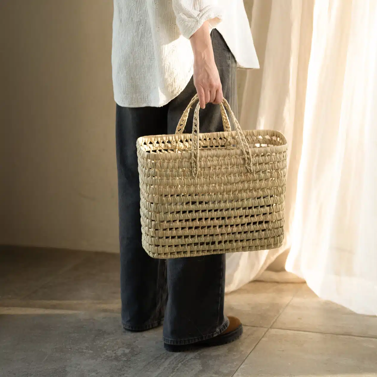 Panier cabas feuilles de palmier Ajoutez une touche d’exotisme et de nature à votre intérieur avec ce panier cabas feuilles de palmier en osier. Conçu de manière artisanale, chaque panier est unique, offrant un charme végétal qui s’intègre facilement dans divers styles de décoration, du bohème au tropical. Pratique et esthétique, il vous permet de ranger vos objets avec style tout en apportant une note chaleureuse à votre espace.