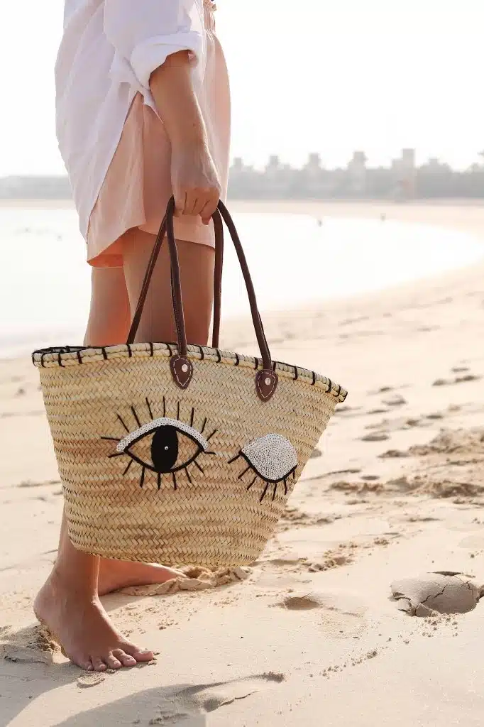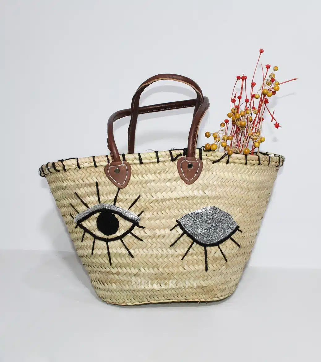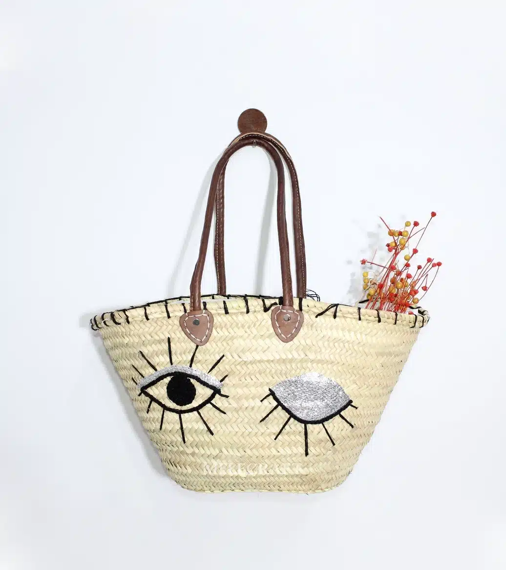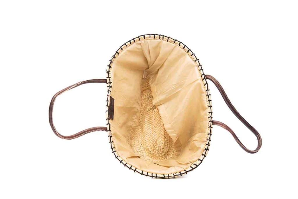 Sac à main naturel orné d’œillets argentés et de poignées en cuir. Taille : 49 x 35 cm Veuillez noter qu’étant donné que tous les produits sont fabriqués à la main, les tailles sont approximatives et peuvent varier. Notre sac Straw Bag classique est tissé à la main à Marrakech à partir de paille, créant ainsi une magnifique texture à chevrons composée de fibres naturelles robustes. Le panier français est idéal pour transporter des produits d’épicerie, du linge et d’autres articles essentiels du quotidien.